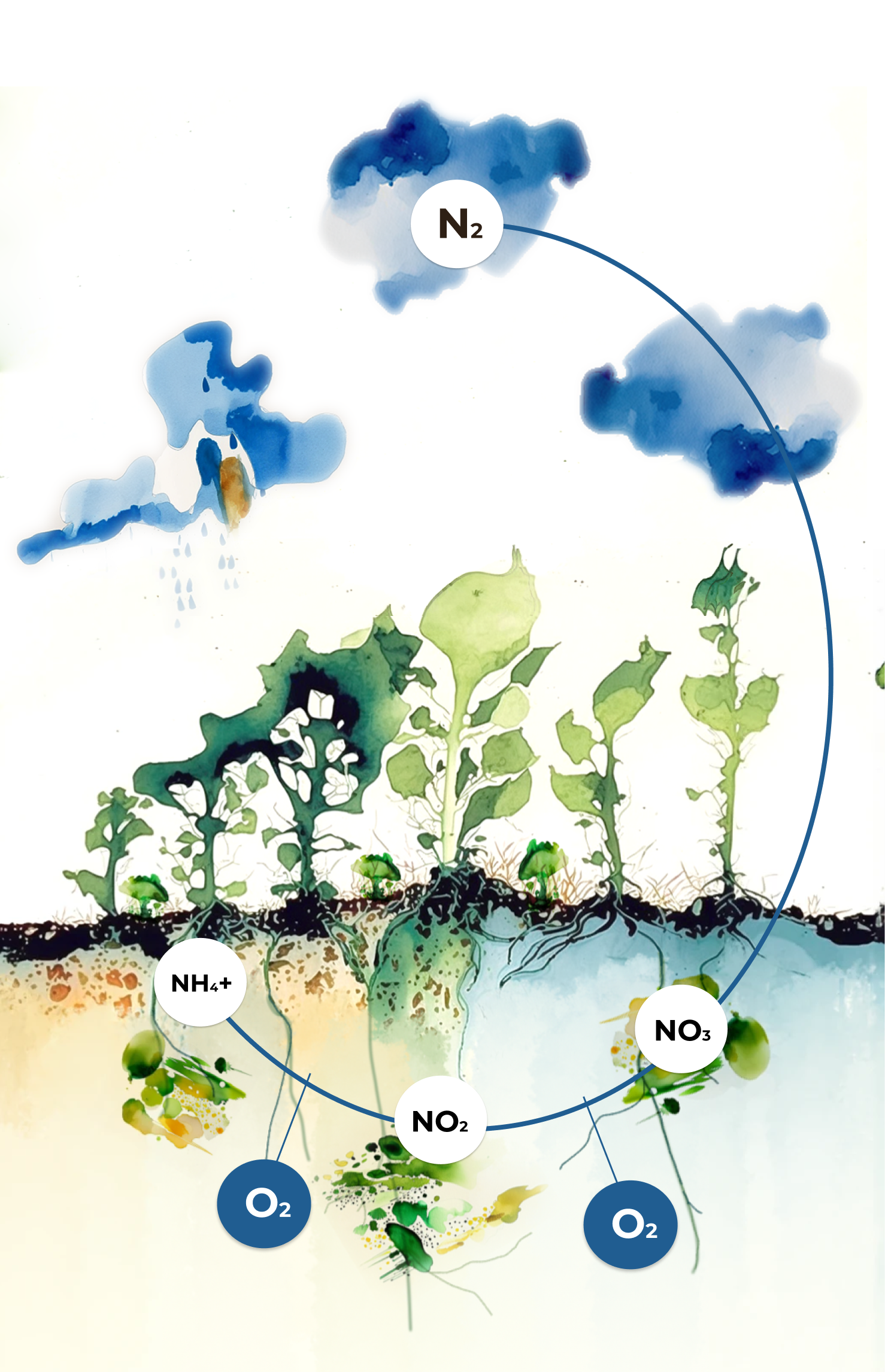 In its pure form, nitrogen is not usable for humans, animals and plants. In its reactive forms however, it becomes accessible and creates impacts at each stage of the nitrogen cycle, moving through the air into the soil and living organisms.